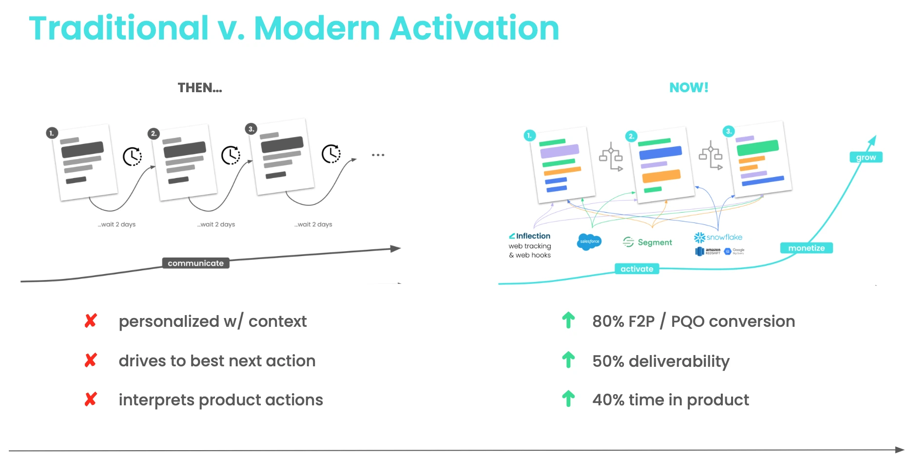 Marketing is naturally good at email journeys to drive conversions. One Inflection.io customer switched onboarding from a daily drip campaign to one based on product behaviors leveraging our modern marketing automation capabilities. The result is an 80% increase in free-to-paid conversions.