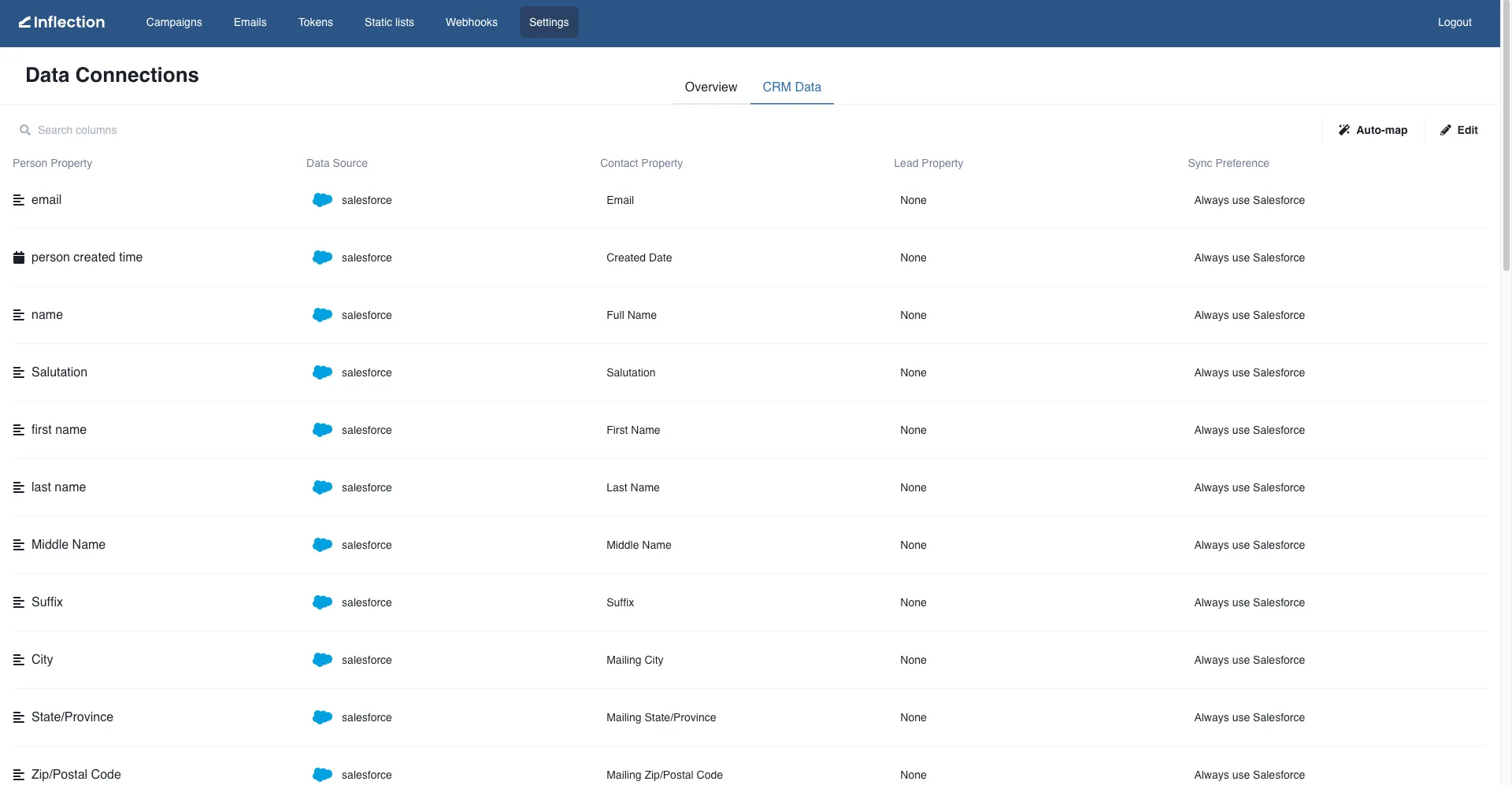 Inflection’s CRM Data screen shows the unified mapping of all Salesforce objects/fields. You can create new fields in Inflection, map custom fields, and re-map existing fields. Auto-mapping of Salesforce leads, contacts, or both is possible with sync preference (Bi-directional, Use only Salesforce, and Prefer Salesforce unless blank) customizable for each field.
