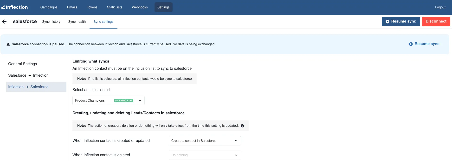 When establishing the sync for the first time, if there are duplicate email addresses in salesforce, Inflection automatically syncs the most recently updated Salesforce record with that email address.