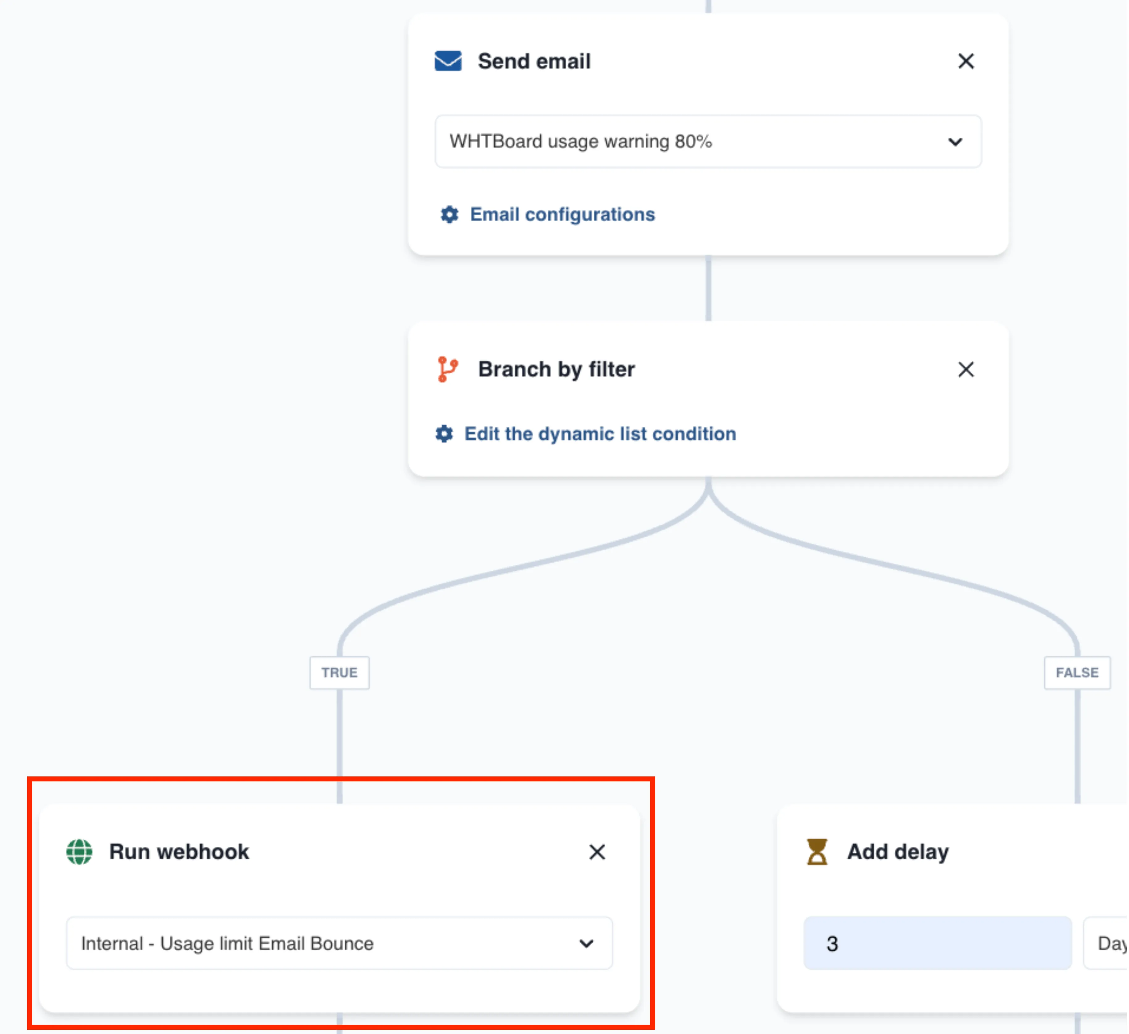 Let’s say your product pricing strategy is usage-based and you set up a dynamic list of audiences who reach 80% of their allotted product usage. If the automated warning email to the customer bounced or if the customer didn’t open the automated email warning about the usage limit after 3 days of sending, you can use webhooks and alert your CSM on Slack. Your CSM can choose an appropriate and timely action so the customer doesn’t end up getting a hefty invoice or locked out of the product till the plan renews.