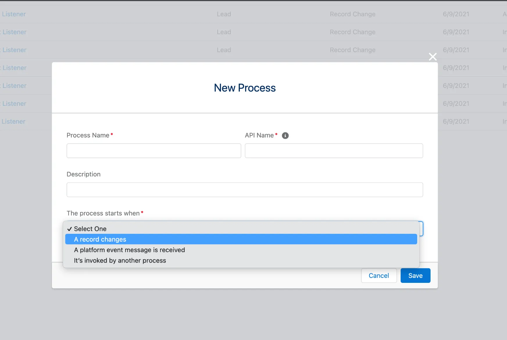 Create a process for each object you’d like to sync and set up the criteria for running the process from the drop-down list.
