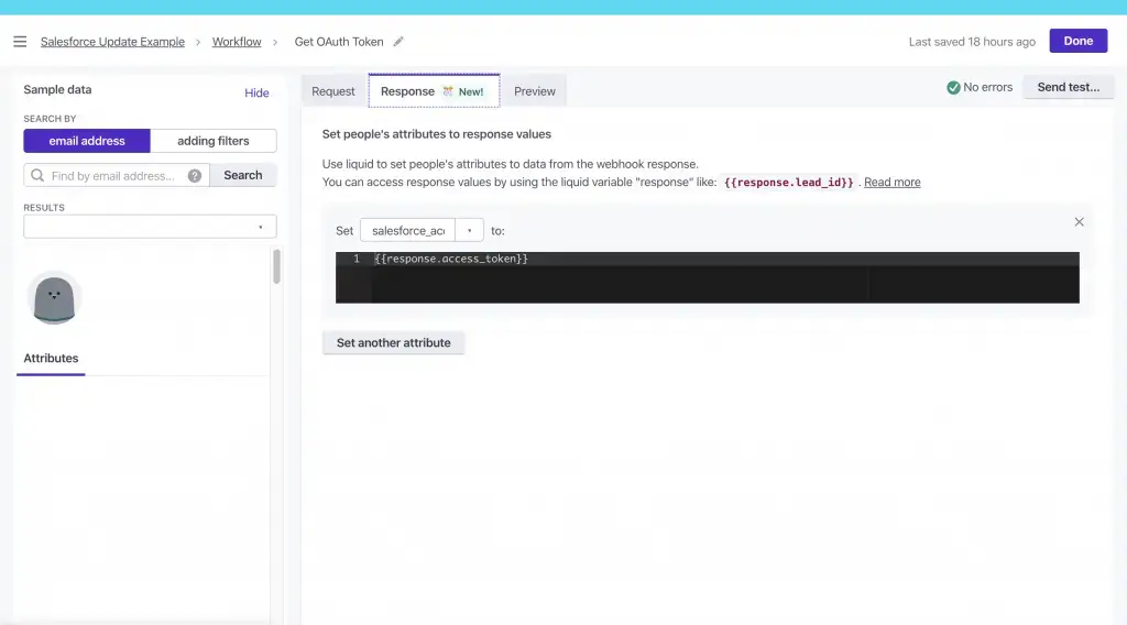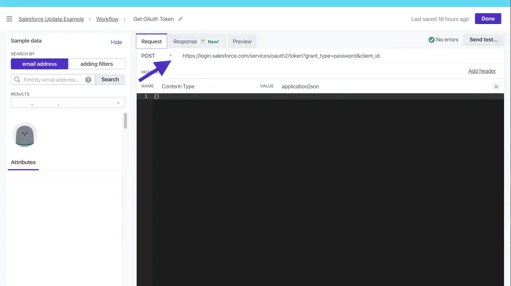 To draw the Authorization token you’ve set up before, include two headers in your webhook – Content-Type set to application/json and Authorization set to Bearer{{customer.salesforce_access_token}}.