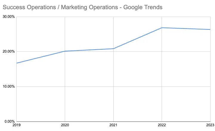 In recent years, the field of Customer Success Operations (CS Ops) has experienced significant growth. In fact, according to Google Trends, CS Ops is growing at a faster pace than marketing operations. Companies like Jasper, Miro, 6sense, and Gong have all recognized the value of CS Ops and have incorporated it into their team.