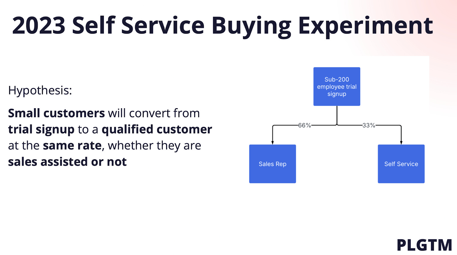 To find out, they ran a year-long experiment in 2023, splitting sub-200 employee leads between classic sales and pure self-serve. The hypothesis: small customers would convert at similar rates, rep or no rep.