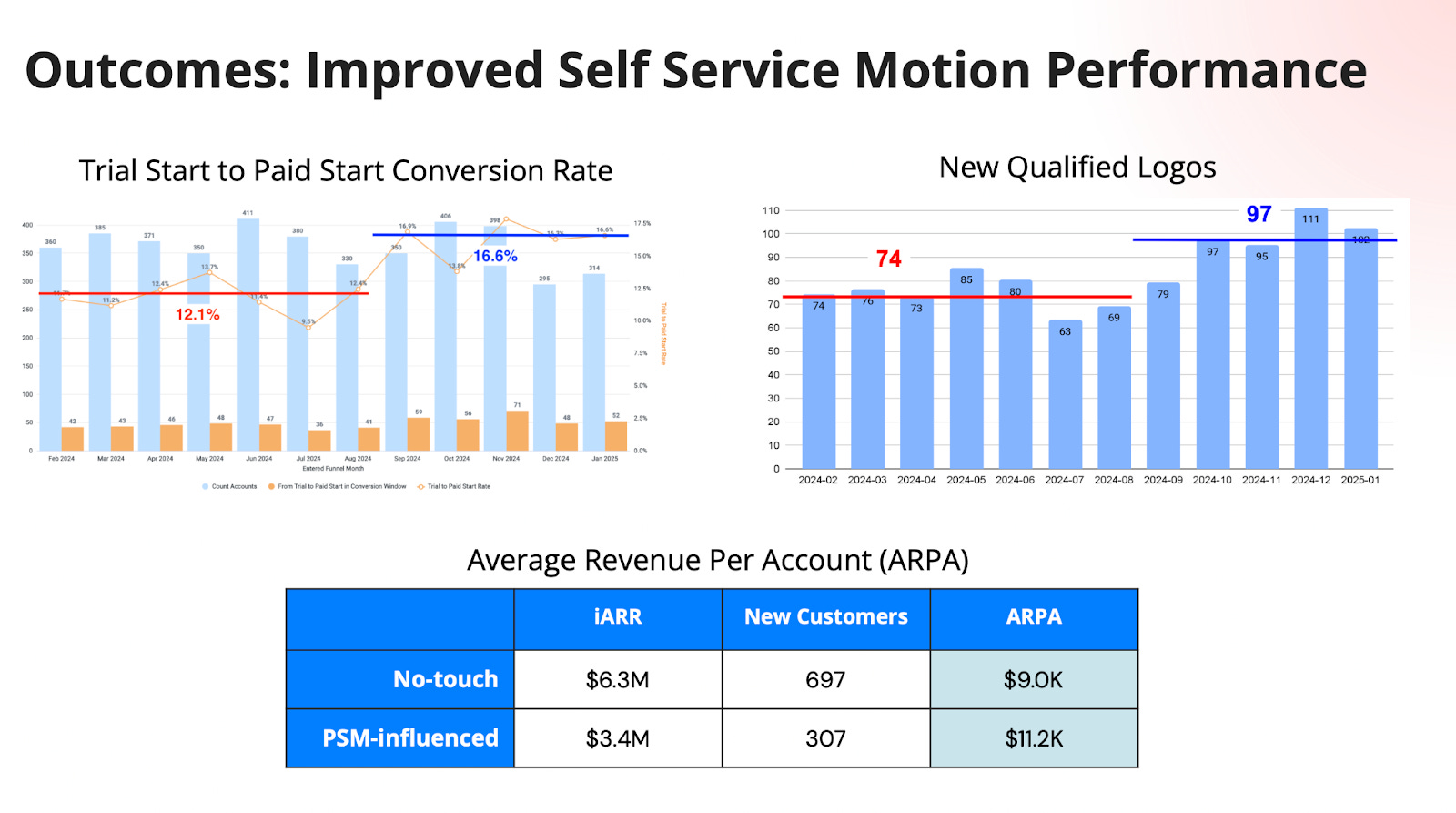Rather than disrupting the no-touch self-service base—which continued delivering around 60 new customers per month—the team layered on PSM-influenced conversions to boost the overall numbers. Trial-to-paid conversion rates jumped to 16.6%, and average new qualified logos per month climbed to 97.