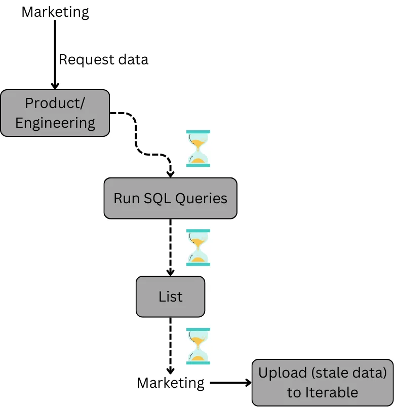 More specifically, marketing was dependent on product and engineering support for pulling lists based on product data. Sendoso’s internal process to access product data for marketing use cases looked something like this: