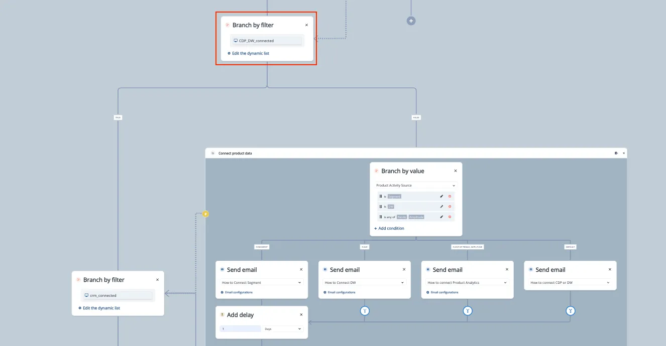 It is necessary to exclude users from certain steps that offer no value. For example, we just discussed the personalized instructions to Inflection’s users based on their product data source. Here’s a zoomed-out snippet of the same stage in onboarding which shows the branch filter step before the integration resources step checks if the user already connected their product data source to the Inflection platform.