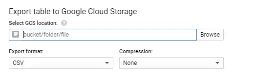 - Choose Export to Cloud Storage and the Export table to Google Cloud Storage pop-up window is displayed.