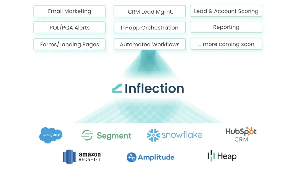 To be able to run product activity-based campaigns enriched with firmographic intelligence, businesses need a solution to tap into product events and CRM data. And, this is exactly the idea behind Inflection.io.