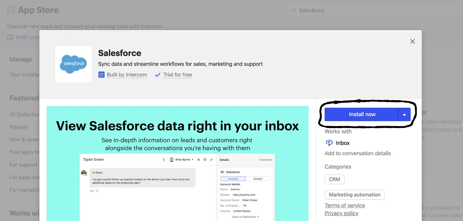 Step 1: Find and install the Salesforce app from the Intercom app store.