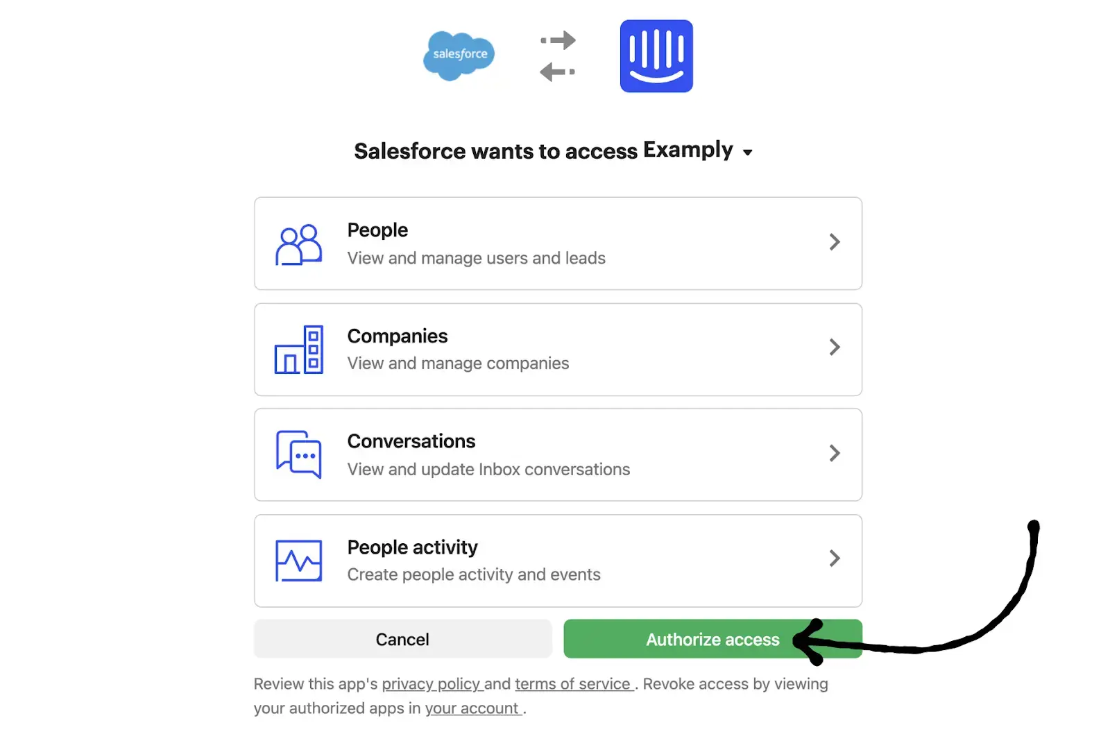 Step 2: Authorize Intercom access from the Salesforce app when prompted. Once the connection is established, the data is synced whenever a record (user or lead) is updated.