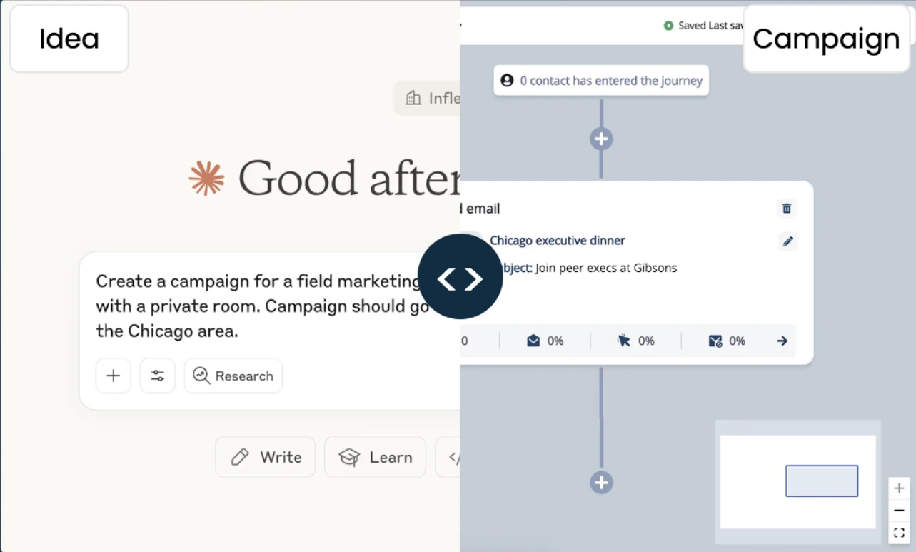 Using Inflection’s new Model Context Protocol (MCP) server, you can build full journeys, audiences, and emails from a single prompt, utilizing all the data Inflection has about your contacts and accounts, including Salesforce, product data, marketing activity, and any large datasets streamed from your data warehouse.