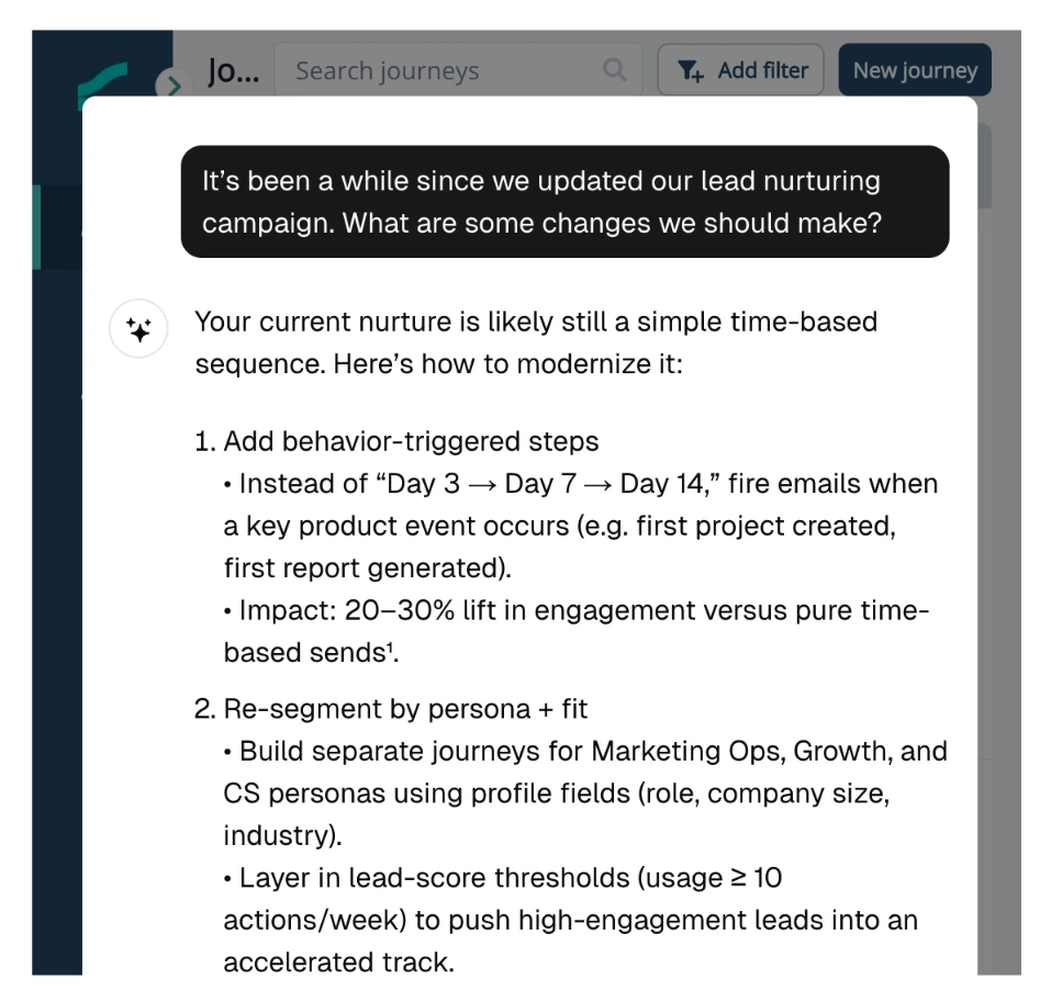 Human-in-the-loop is not optional. It’s core to the design. You can always edit the output, whether it’s a single email, a multi-step journey, or a dynamic audience segment. The system gives you full transparency into what’s being built, why it’s being built, and where it’s being sent.