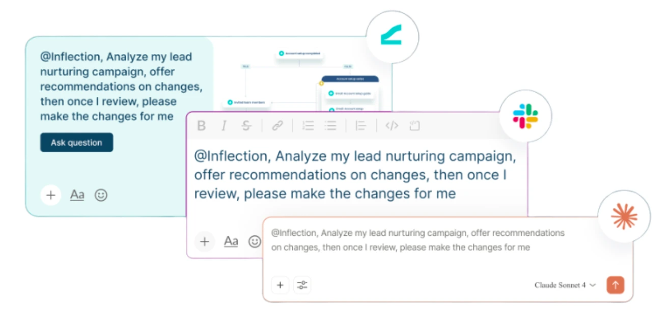 Inflection is an open platform by design, allowing you to interact with AI wherever your team works. This includes in the Inflection product, in Slack, or in platforms like Claude.
