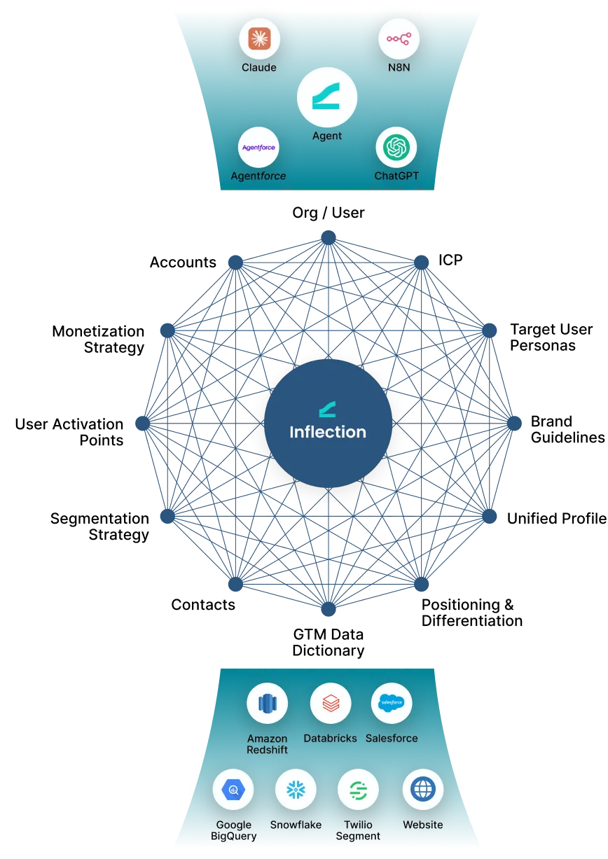 Inflection is able to offer this functionality thanks to the ContextGraphTM, Inflection’s proprietary context engine. The ContextGraphTM ingests all your first-party data across Salesforce, data warehouses, CDPs, website, etc, then adds semantic modeling to capture the meaning of the data and make the data meaningful. Everything your systems know about Accounts and Contacts, your monetization strategy, your product marketing content, your ICP / target personas, and even the structure of data itself like the relationships between users, organizations, and workspaces.