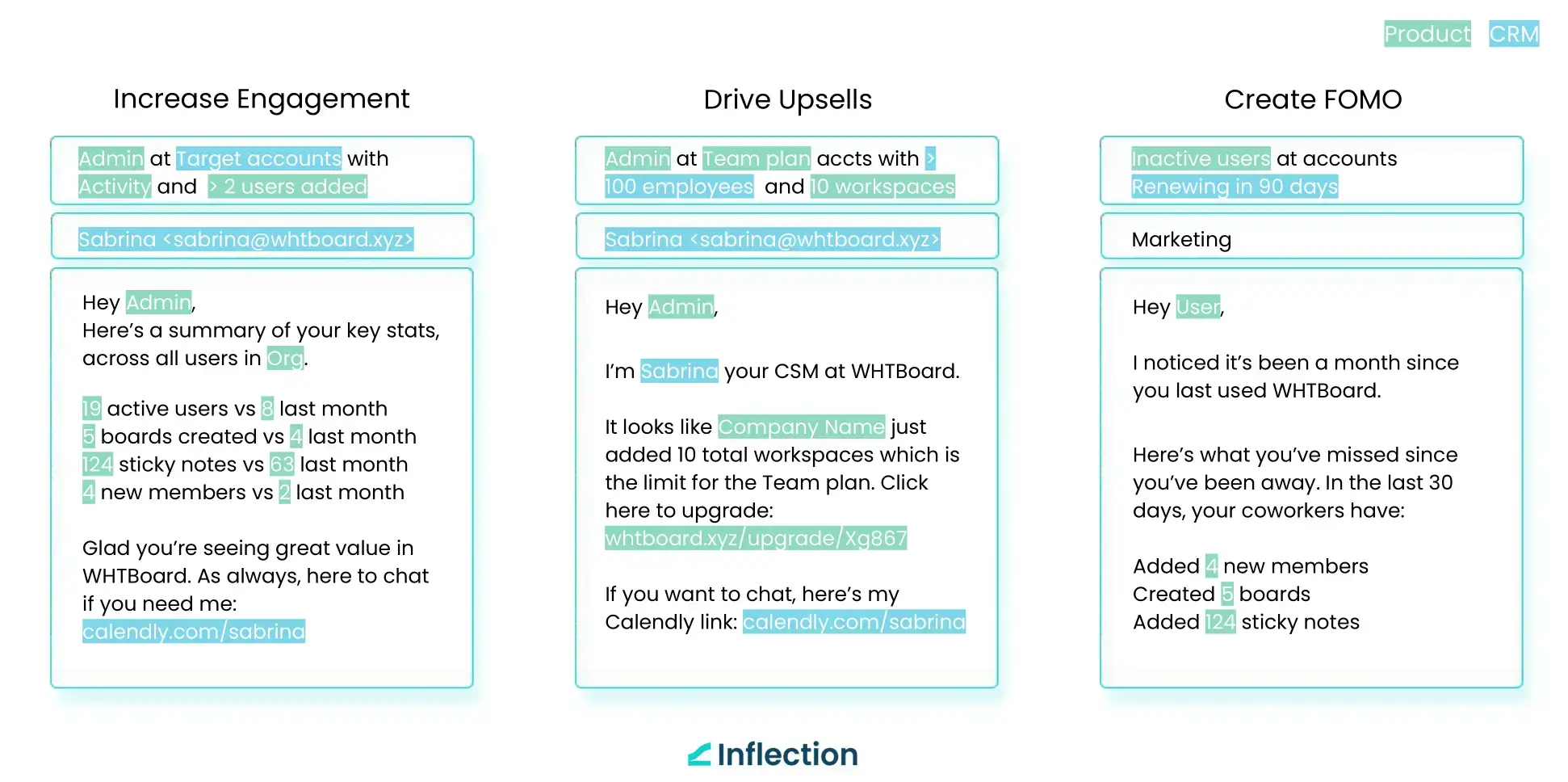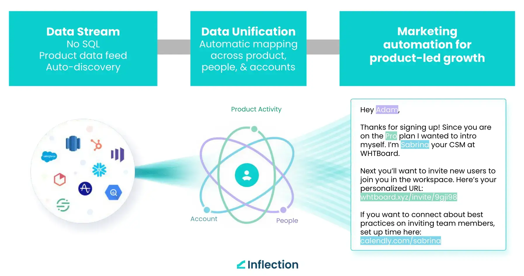 With Inflection and Twilio Segment integration, unleash the combined power of data and context. You can set product-led marketing automation in motion fueled by a real-time data stream of product events and CRM data. Read more about the integration on Twilio Segment's integrations catalog.