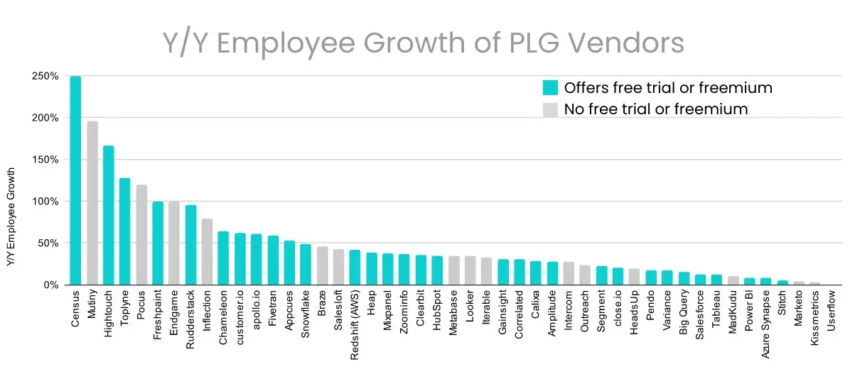 46 out of the 47 vendors registered positive year-on-year employee growth. Census had the highest employee growth of 250% in the past year.