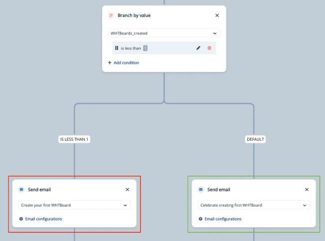 Let’s say WHTBoard is a digital collaboration platform for teams. Their aha moment is when the users create their first whtboard with project data pre-populated. Marketing at WHTBoard sends an email to help their free users create their first digital collab space but, only after verifying that the users haven’t already. This is part of their onboarding campaign.