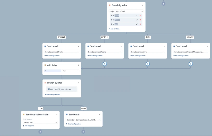 Send resources to help maximize value from the most relevant features. Here’s an example from WHTBoard. The onboarding journey leads their sign-ups through instructions to integrate their project management tool. The users matching ICP are contacted by a CSM for a more personal approach and to fast track aha moment.