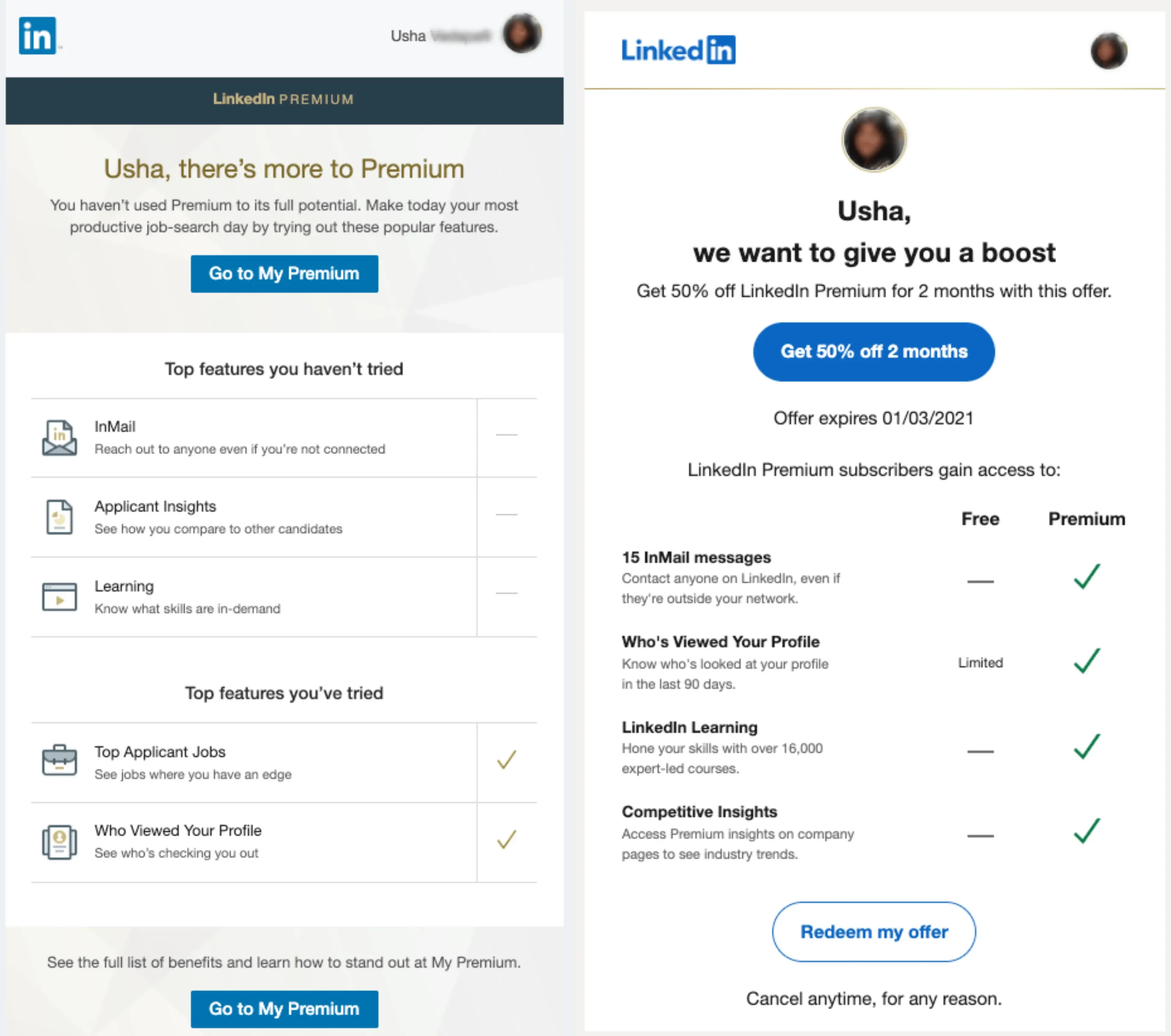LinkedIn nudges their premium subscribers to make the best out of the premium features and follows up with a discount offer. The reactivation email also answers any questions about the value of renewing the premium subscription.