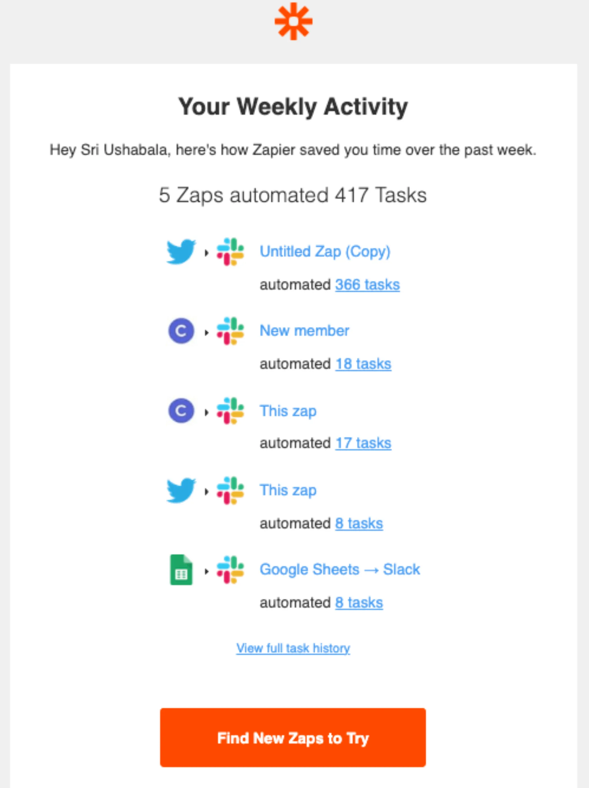Give your users a reason to get back into the product. Zapier is a great example of using curiosity to drive more product usage from weekly reports.