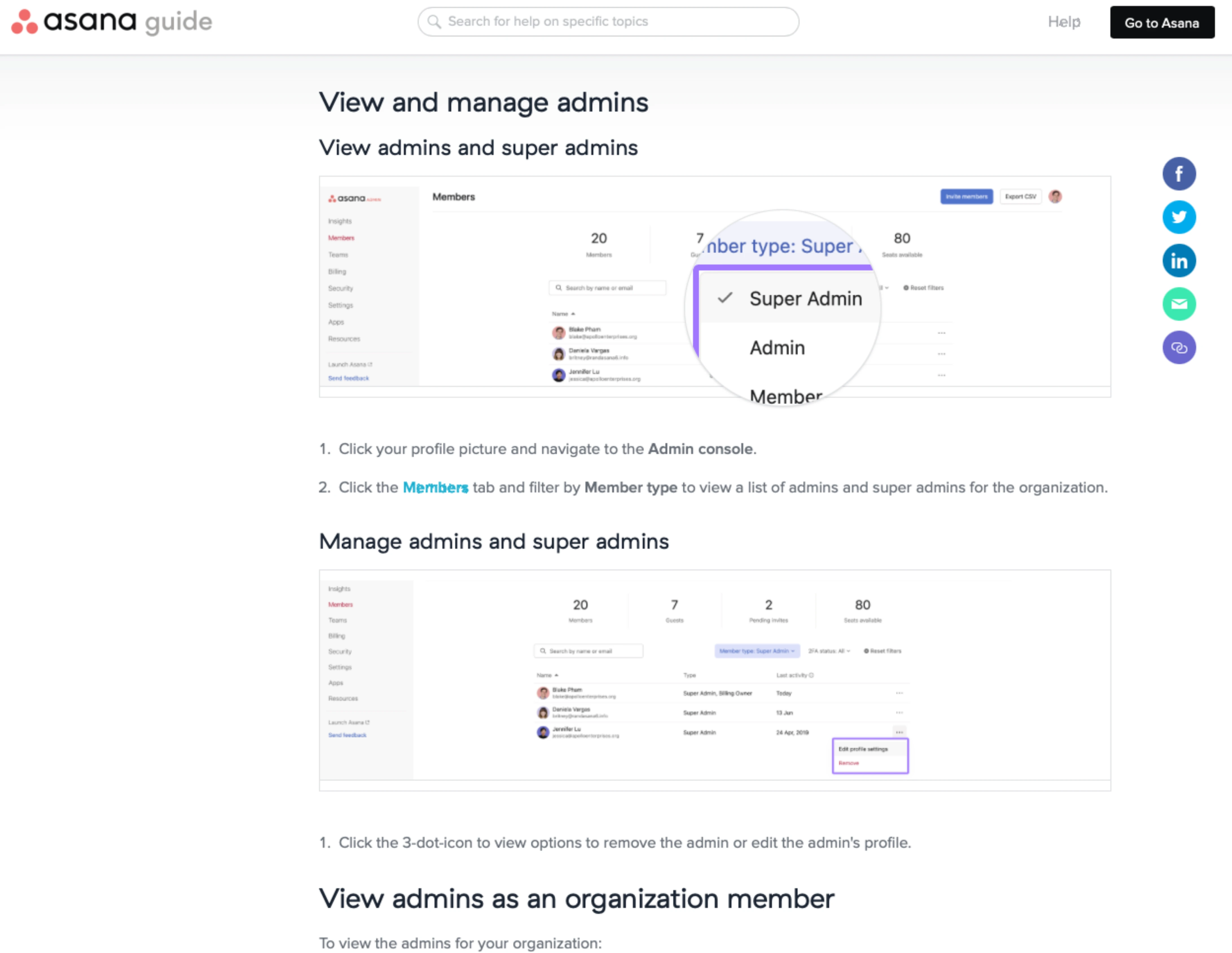 For example FAQs for System administrator, product tour for a Team Manager, How-To video tutorial library, and so on. Asana’s welcome email has a section that redirects Admin and Super Admin users to the relevant section to set up necessary settings.