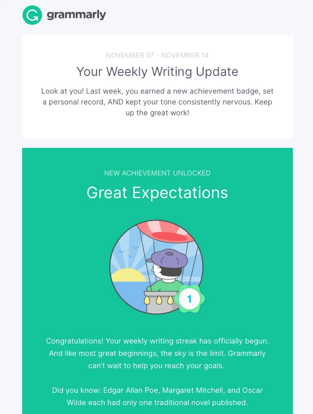 Kudos if you’re already sending product activity-based emails for onboarding new customers. Strive to personalize them further and optimize for better conversions. Grammarly’s onboarding emails triggered by product activity knock it out of the park.