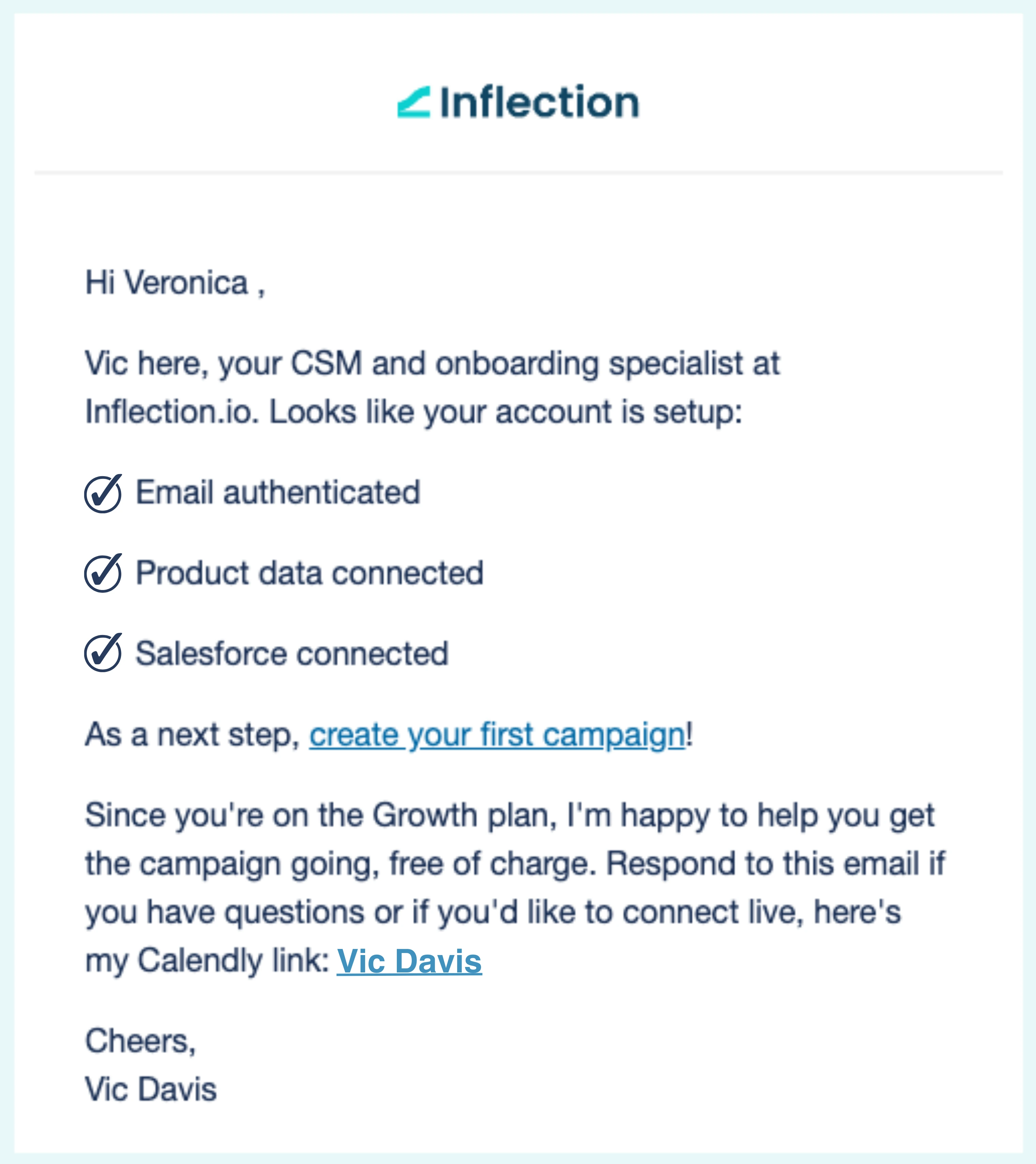 Help users see more value in your product and understand their next steps to guide them better. You can do this via in-app help, push notifications, onboarding emails, checklists, and other possible means to guide your users through an ideal onboarding journey. At Inflection.io, we send an email to move along in the onboarding process.