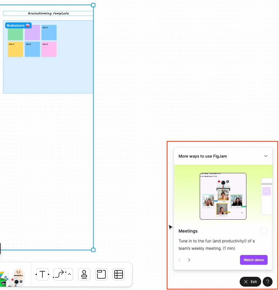 In-app notifications can be a great way to guide users in your product to important differentiating features, missing setup information, and more. FigJam onboarding guide has 3 steps. If the new user doesn’t complete exploring the video guides on all three topics, a notification on the bottom right corner reminds the user to do so without intruding in their workspace.