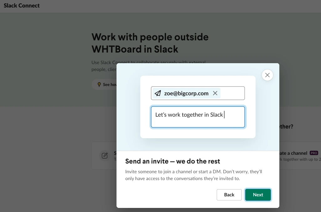 If your product delivers more value with network effect (more value as more users start using it), for example, Slack encourages users to invite their friends and colleagues to the product by making it easy to connect with anyone outside your workspace too.