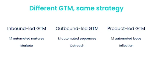 Sending the exact same nurture emails or the same outbound message did not work then. Both Marketo and Outreach became the leaders in their respective eras by recognizing the fact that one-size-fits-all is not acceptable and enabled automated and tailored experiences with a different GTM.